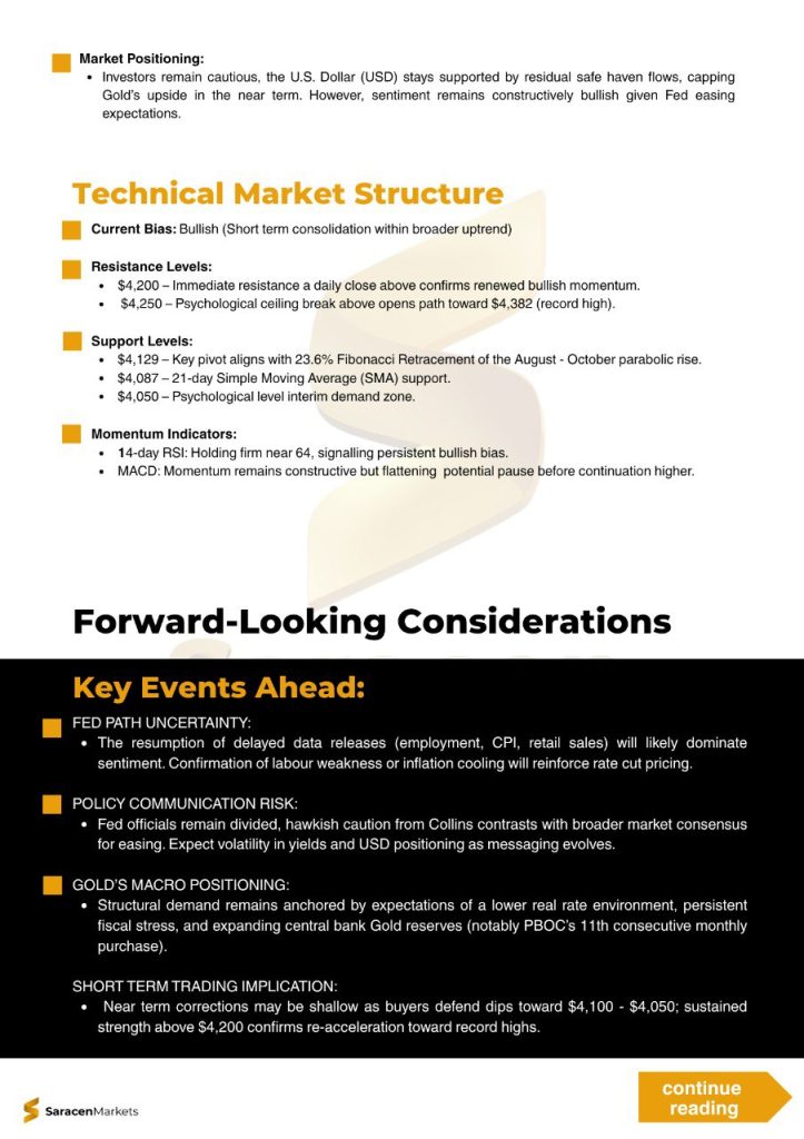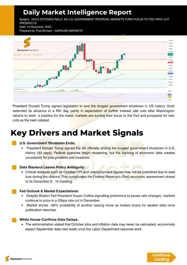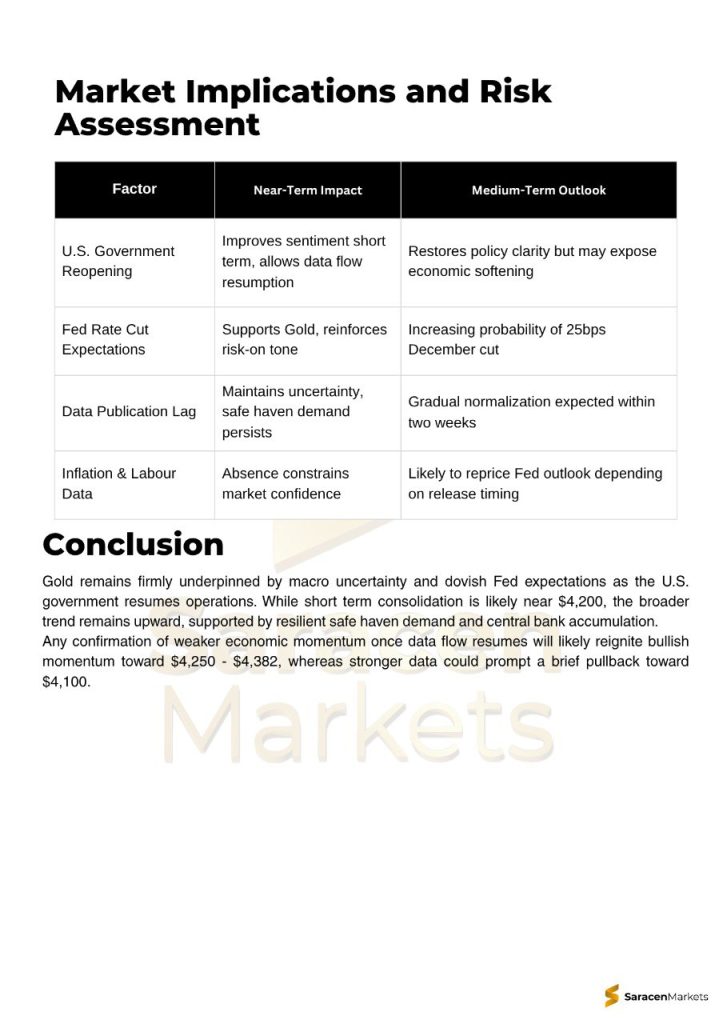 - The end of the shutdown restores confidence, but missing CPI and jobs data now leave the Fed navigating blind a setup that keeps gold firmly supported.